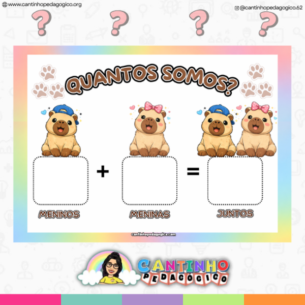 O Cartaz Quantos Somos – Tema Capivara é um material pedagógico e decorativo em PDF, ideal para organizar a rotina da turma e trabalhar conteúdos de matemática de forma visual e lúdica.